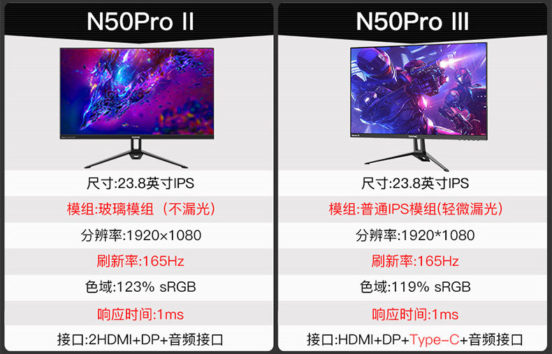 颜色分类:N50proII[165hz/1ms响应/格拉斯模组]-D22(biqru),G2450P+144Hz电竞屏-S68(wxcnl),N50proIII[165hz/1ms响应/Type-C接口]-R66(cxqig)套餐类型:官方标配是否触摸屏:否